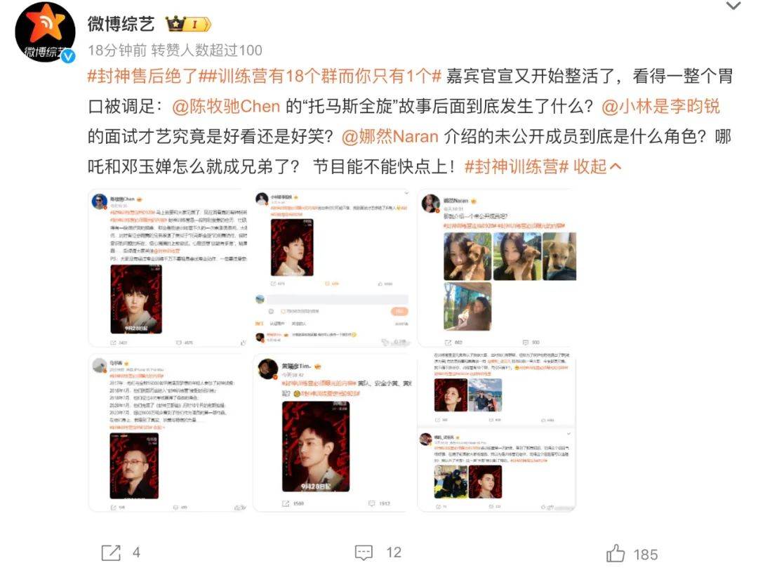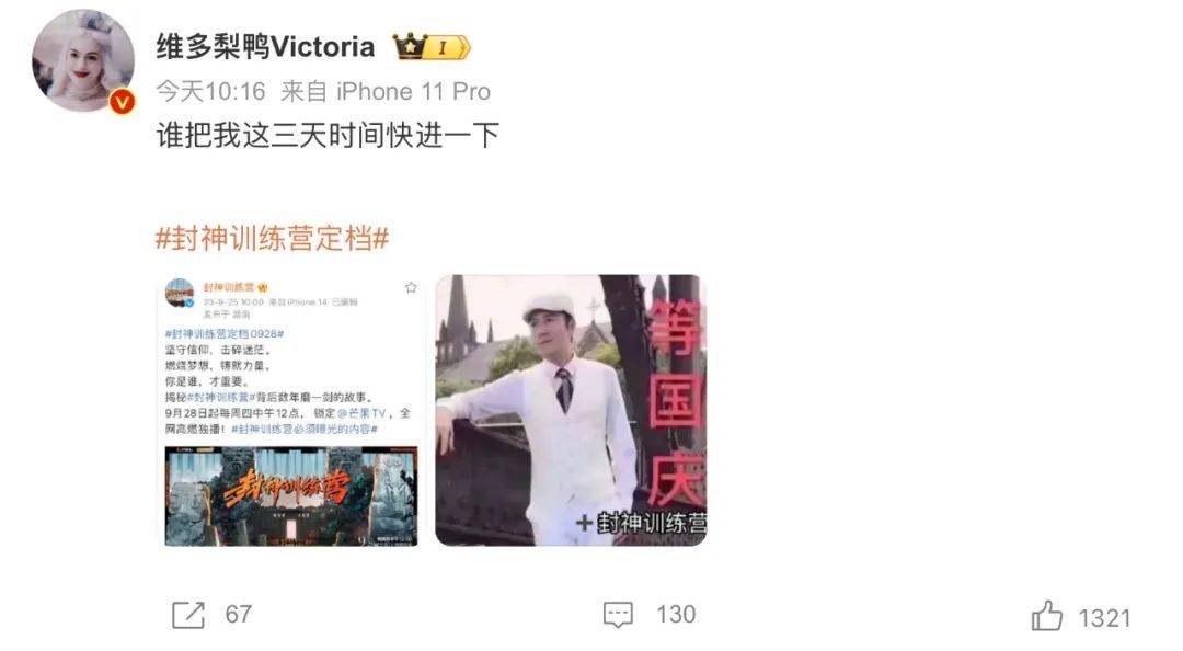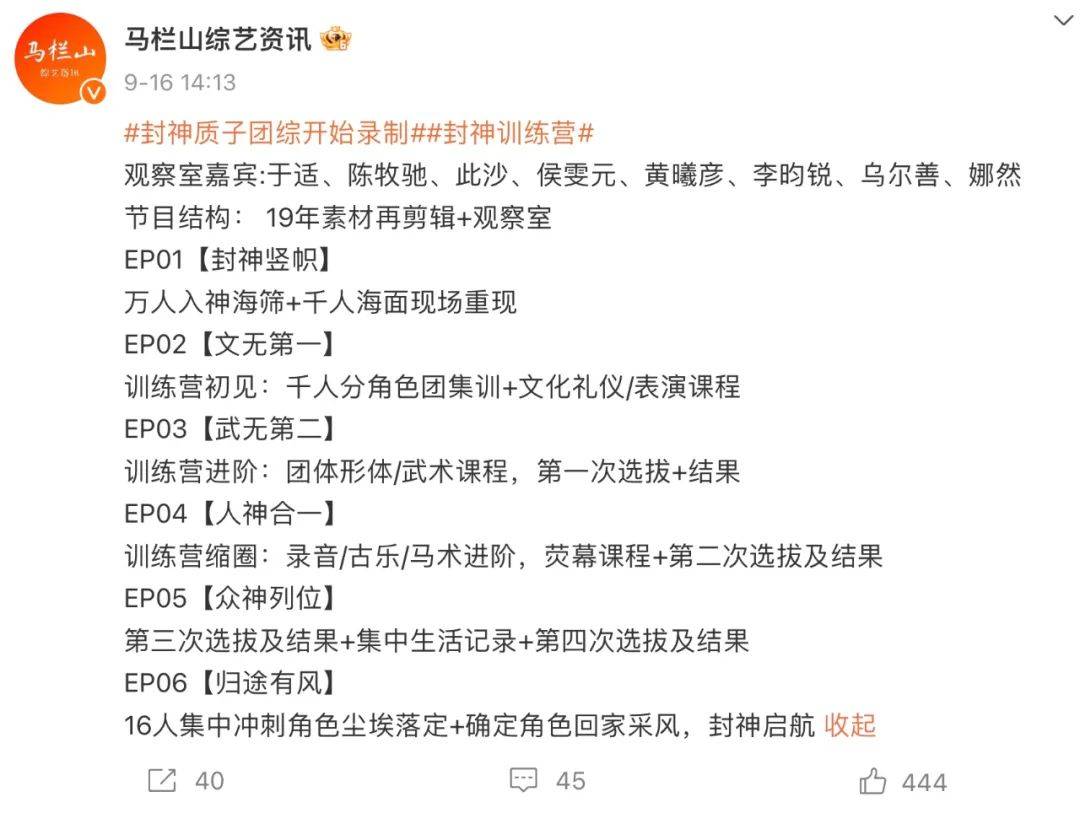 再就是9月25日,《封神训练营》官博开通并官宣了节目“9月28日起每周四中午12点在芒果TV独播”的消息。要知道,一般综艺从录制到后期到开播怎么也得等个把个月,《封神训练营》项目能如此高效推进还是震动了行业。