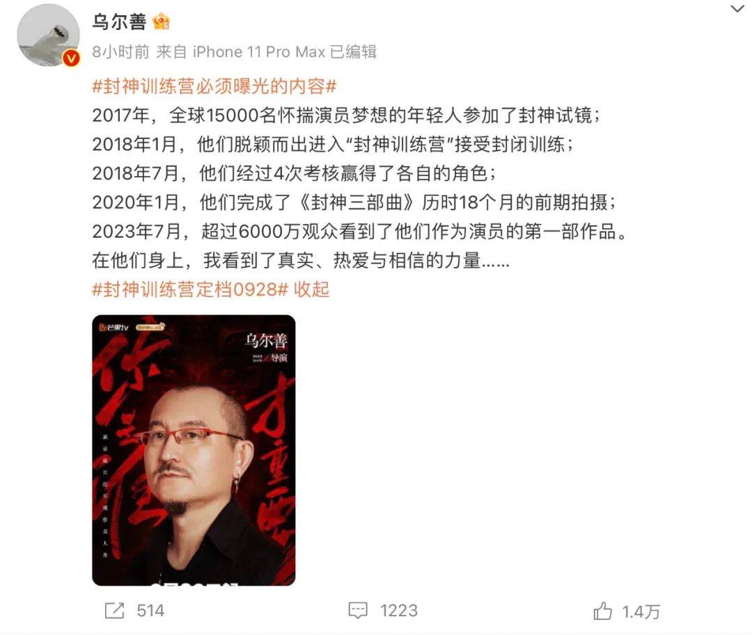 而这波主创们“亲自下场”的宣发动作,揭示出《封神训练营》的更多细节。由乌尔善参与的 #封神训练营必须曝光的内容# 话题下,他透露节目将公开17年全球15000名年轻人参加封神试镜、18年30多名演员进行24周封闭集训等珍贵视频素材。