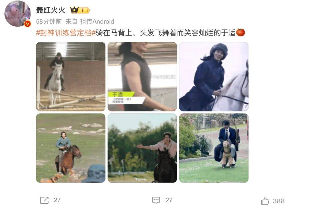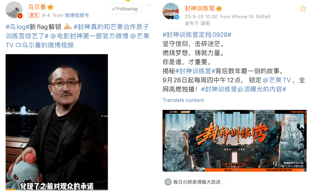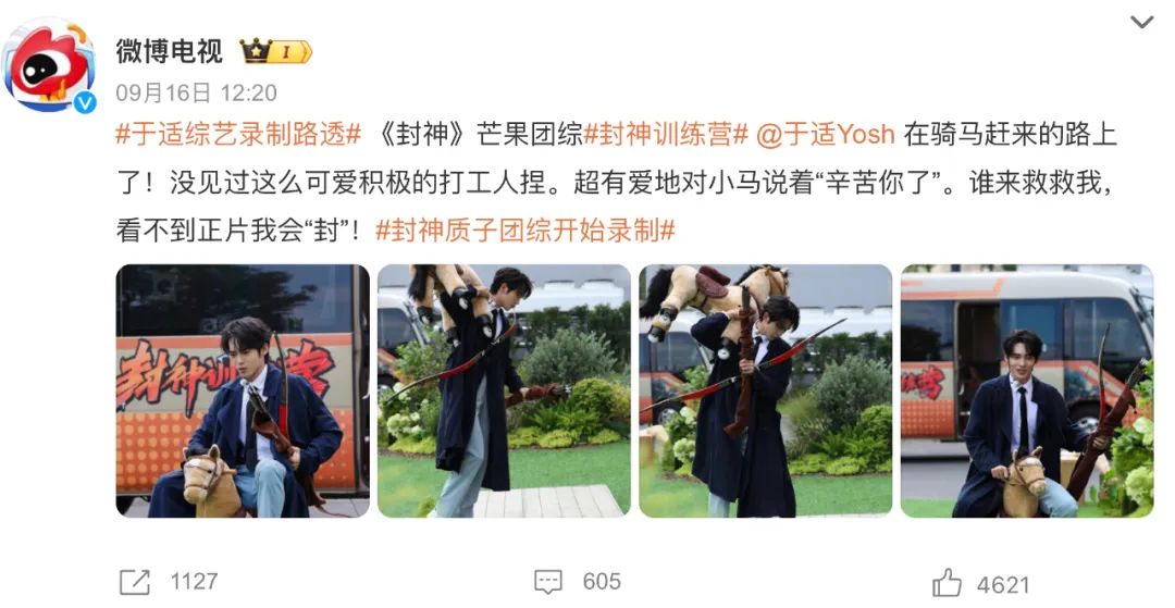 仅一周后的9月16日,经多方微博路透证实,很多《封神》电影主创已集体现身长沙录制《封神训练营》,诸如“于适骑小木马上班”、“乌尔善带着合同来芒果”的路透素材引发热议,带火了高位热搜 #封神质子团综开始录制#。