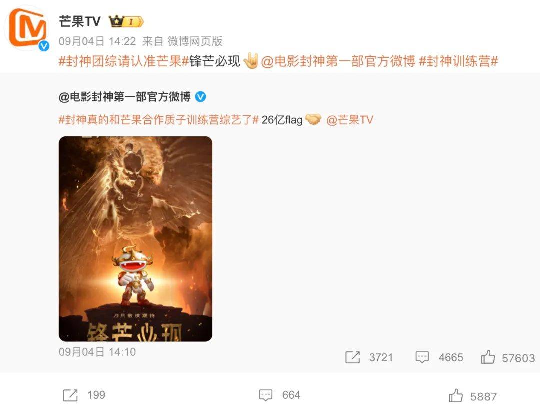 彼时,该海报实际承担了电影宣发 综艺宣发的双重职责。在那条电影官博中,该综艺被定位为解锁电影票房破26亿flag的“粉丝福利”,带动了话题 #封神真的和芒果合作质子训练营综艺了# 冲上微博热搜高位。