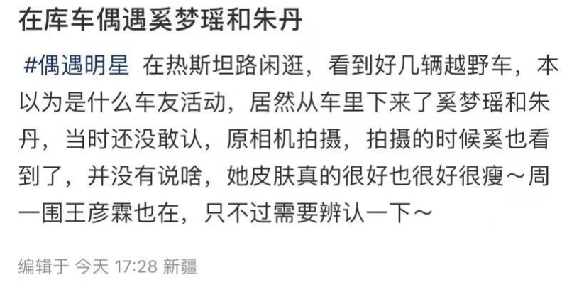 9月25日,有网友在个人社交平台分享出在新疆偶遇朱丹与老公周一围动态,据悉,现身新疆的夫妻二人并非私人旅行,而是在录制芒果综艺《爱的修学旅行》,而在网友分享的偶遇照中,与他们同行的还有奚梦瑶、金莎及其男友以及王彦霖夫妇,浩浩荡荡的一行人这样走在街头,想要不被关注都难。