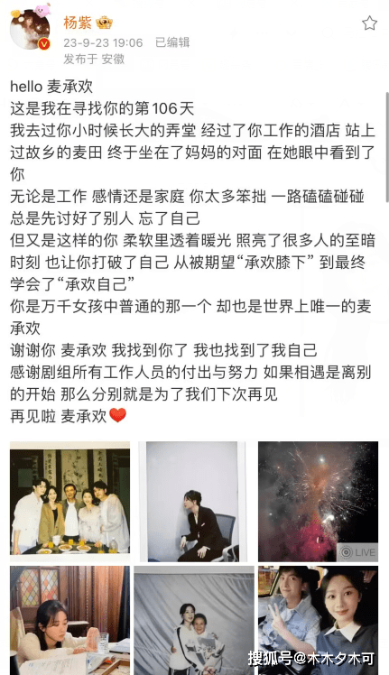 近日杨紫也是刚刚结束新剧《承欢记》的拍摄工作,该剧男主是许凯,可谓男帅女美的组合,23号当天杨紫还发文告别麦承欢一角,坦言在这100多天里,自己与麦承欢一路相伴,并通过角色找到了自己。