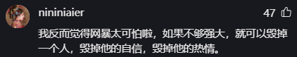 我反而觉得网暴太可怕啦,如果不够强大,就可以毁掉一个人,毁掉他的自信,毁掉他的热情。