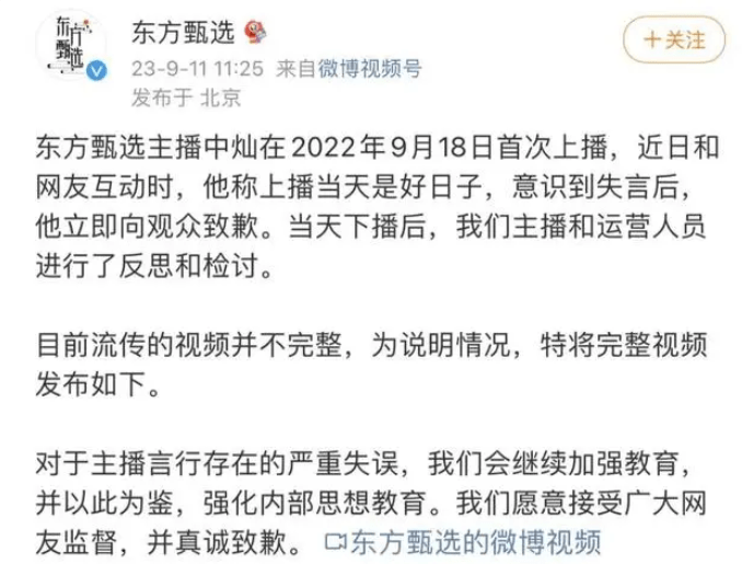 随后东方甄选官微发声,为中灿事件道歉并进行反思