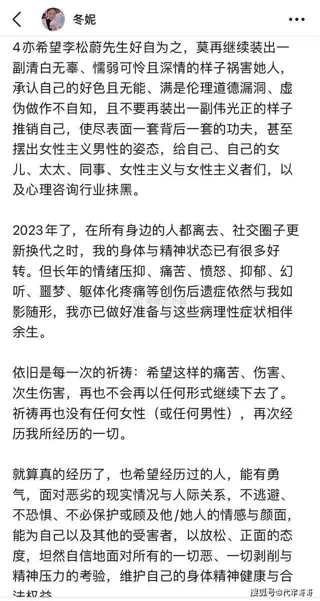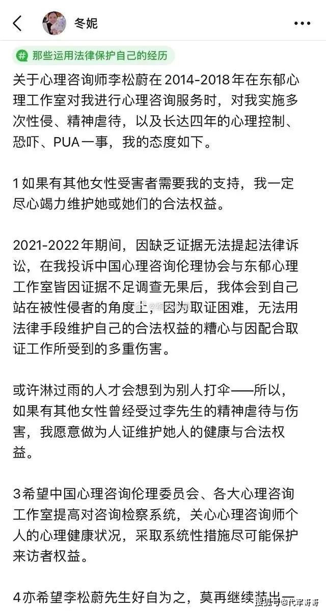 这一事件的曝光,不仅让人们对李松蔚个人的道德品质产生了质疑,也揭示了心理咨询行业中的潜在问题。我们应该以此为契机,审视和改进心理咨询的规范与监管制度,保障受助者的权益和安全,建立更加健康、透明的行业环境。