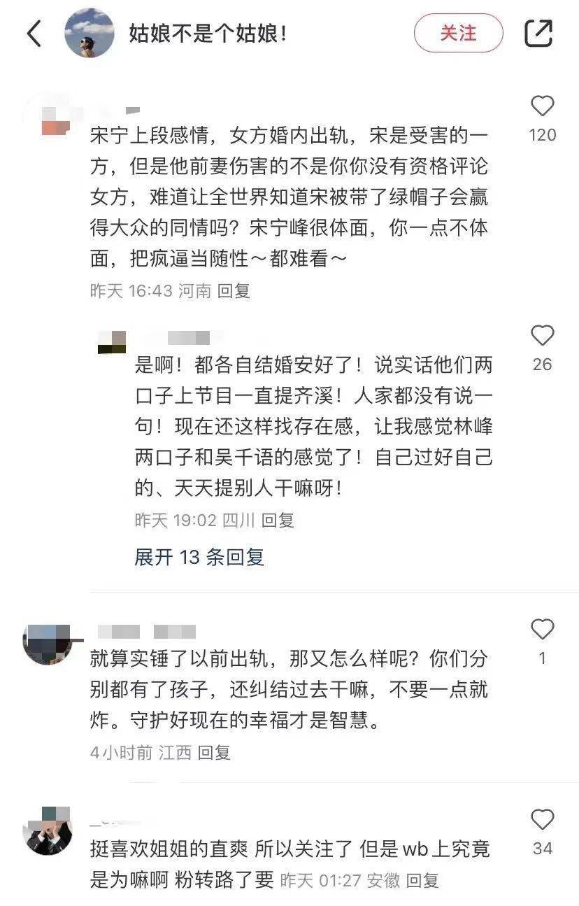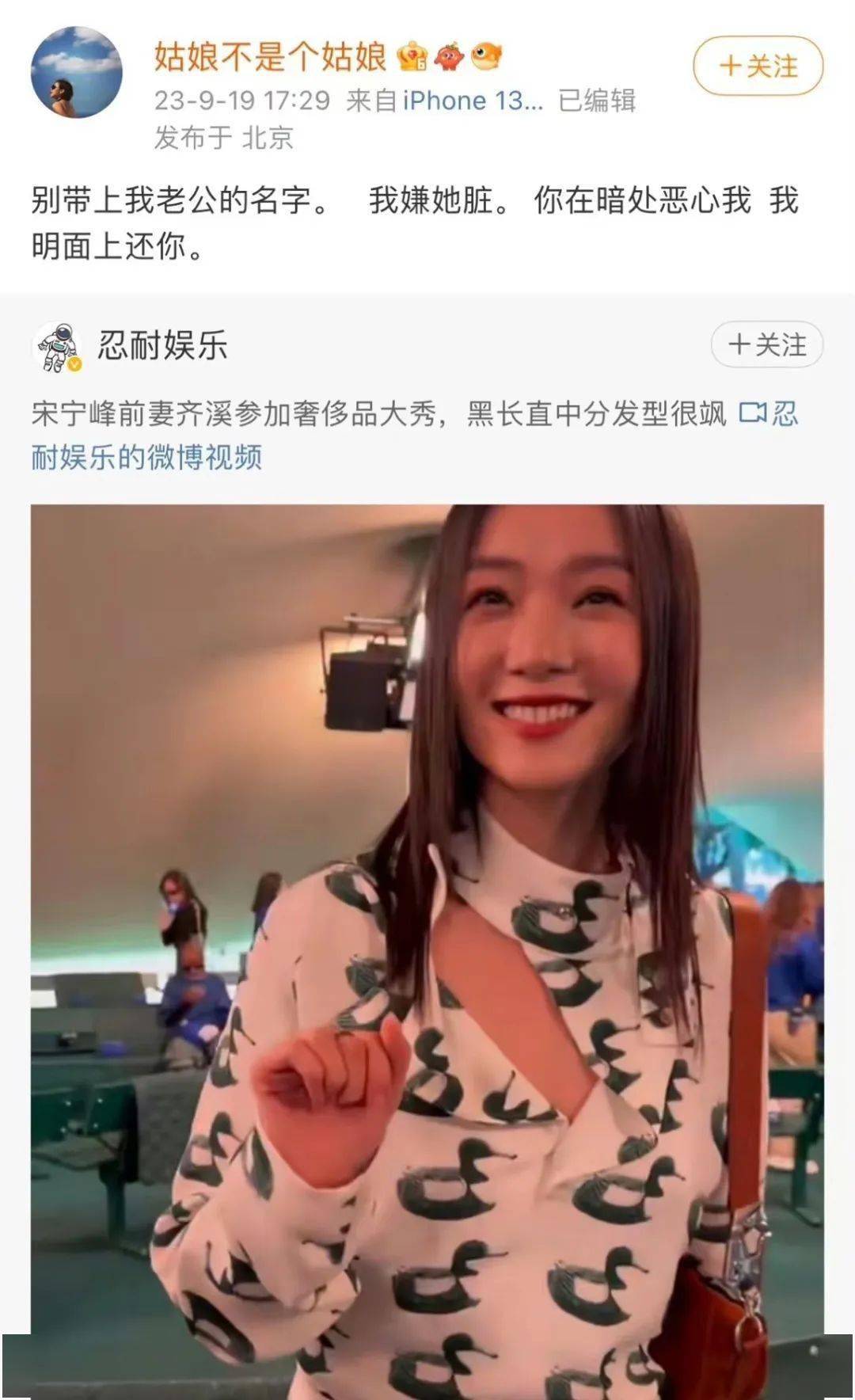 前两天,有博主分享齐溪看秀视频,在她名字前加上了“宋宁峰前妻”,宋宁峰现任妻子张婉婷转发配文:“别带上我老公的名字,我嫌她脏。你在暗处恶心我,我明面上还你”。