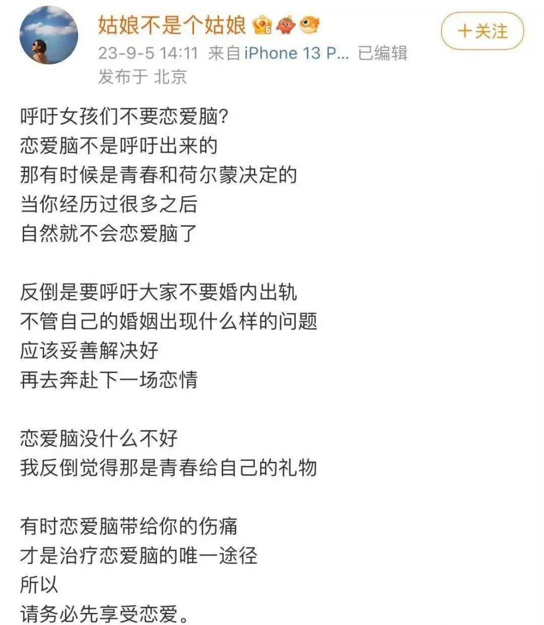 张婉婷就发文:呼吁女孩们不要恋爱脑?反倒要呼吁大家不要婚内出轨.......