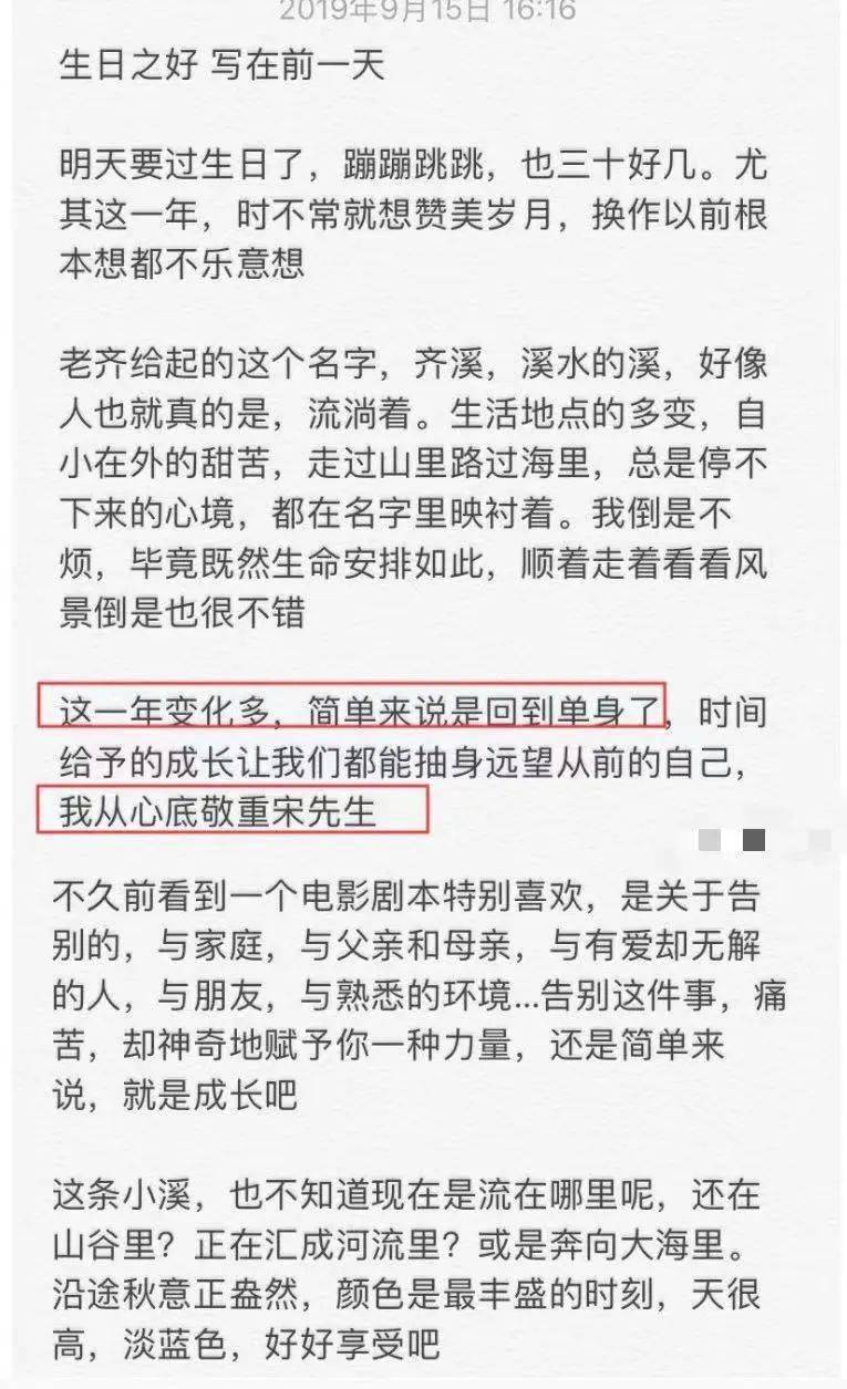 2019年9月,齐溪工作室在齐溪生日前一天发文,表示这一年恢复单身,和宋宁峰已经离婚。