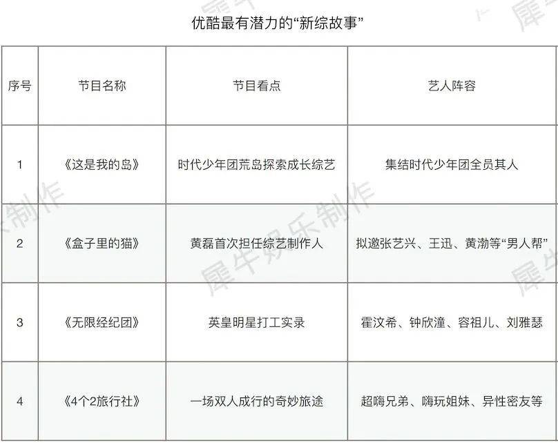 相比各平台头部大项目,这些新综艺最大的劣势就是项目推进不确定性很大。但众所周知,综艺市场的壮大必须仰仗“新综艺故事”去提供活力,从这个层面讲,犀牛君还是希望有更多金主多多关注这些“综1代”。
