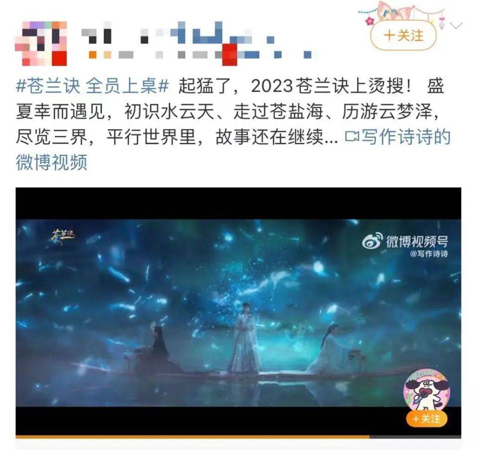 昨天,“苍兰诀 全员上桌”的词条升至微博热搜高位,点开一看,是《苍兰诀》的剧粉集体团建的成果,为了展示《苍兰诀》从主角到配角都实现“飞升”的造星功力。