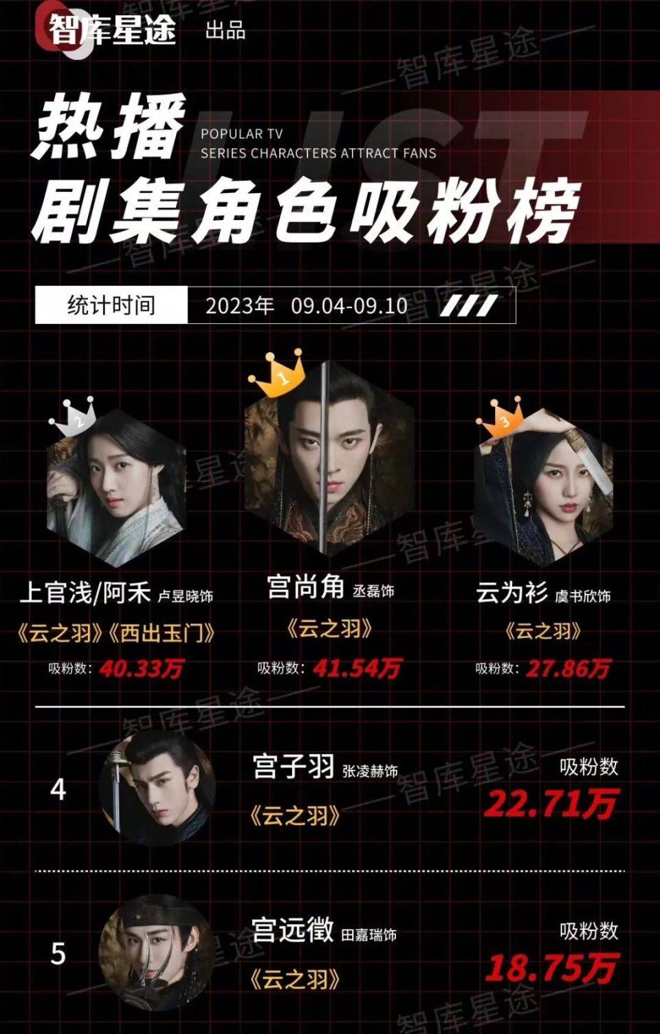 虞书欣粉丝着急维权,可能也是害怕最后“无效播剧”。根据智库星途上周的统计,《云之羽》里最吸粉的是男二丞磊和女二卢昱晓,女主只排到第三位。