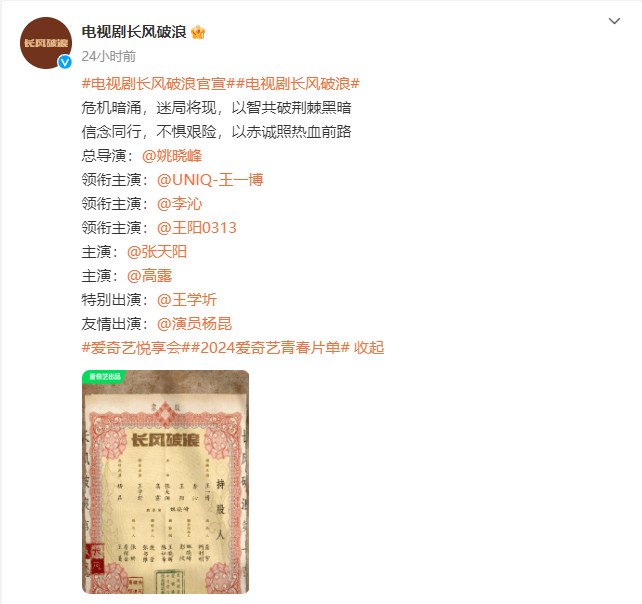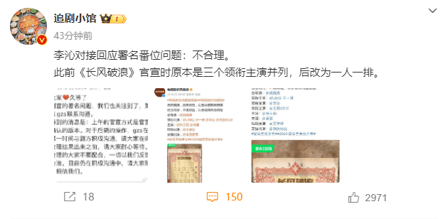 9月21日上午,电视剧《长风破浪》官宣,在领衔主演一栏当中,把几位主演放在了同一排当中,顺序如下:王一博、李沁、王阳。当日16点,这则官宣的内容出现了微妙的变化,领衔主演被分成了三排,第一排是王一博,第二排是李沁,第三排是王阳。
