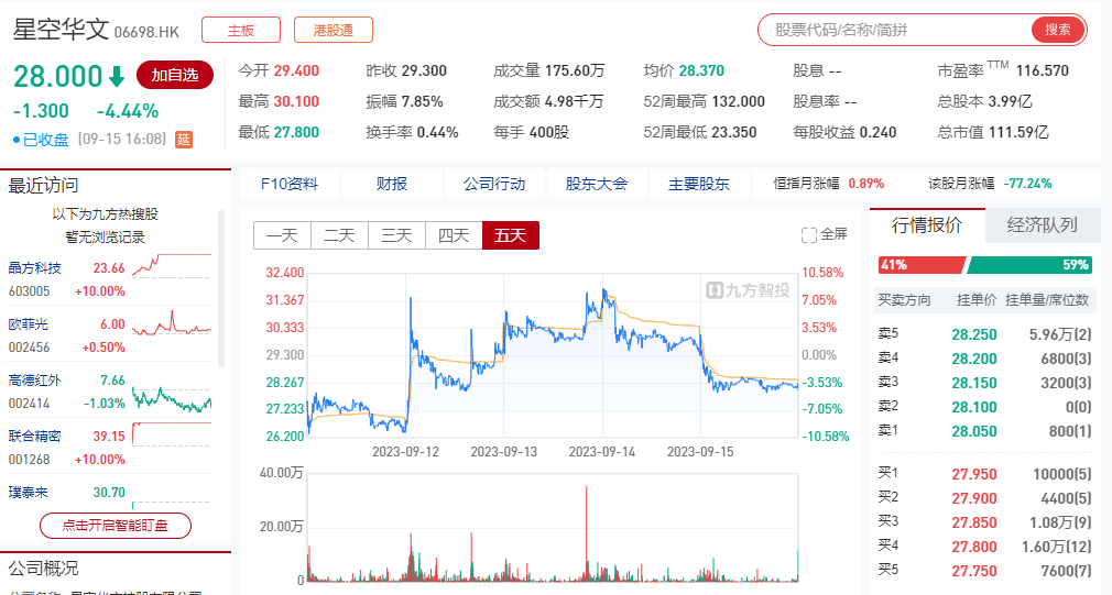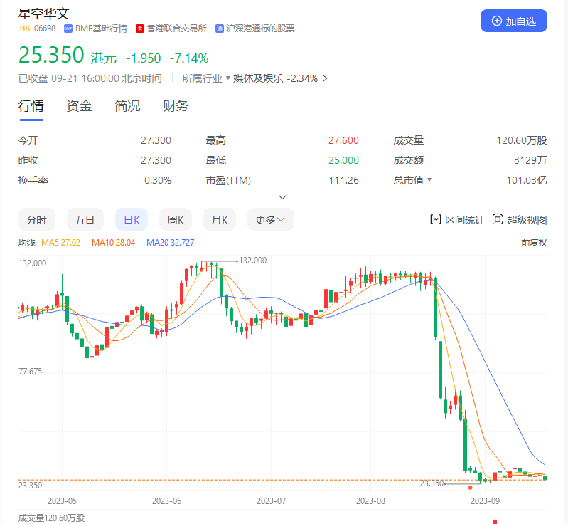 9月21日,星空华文股价继续下行,开盘价是27.3港元每股,收盘价是25.35港元每股,跌了近2港元,跌幅不低!