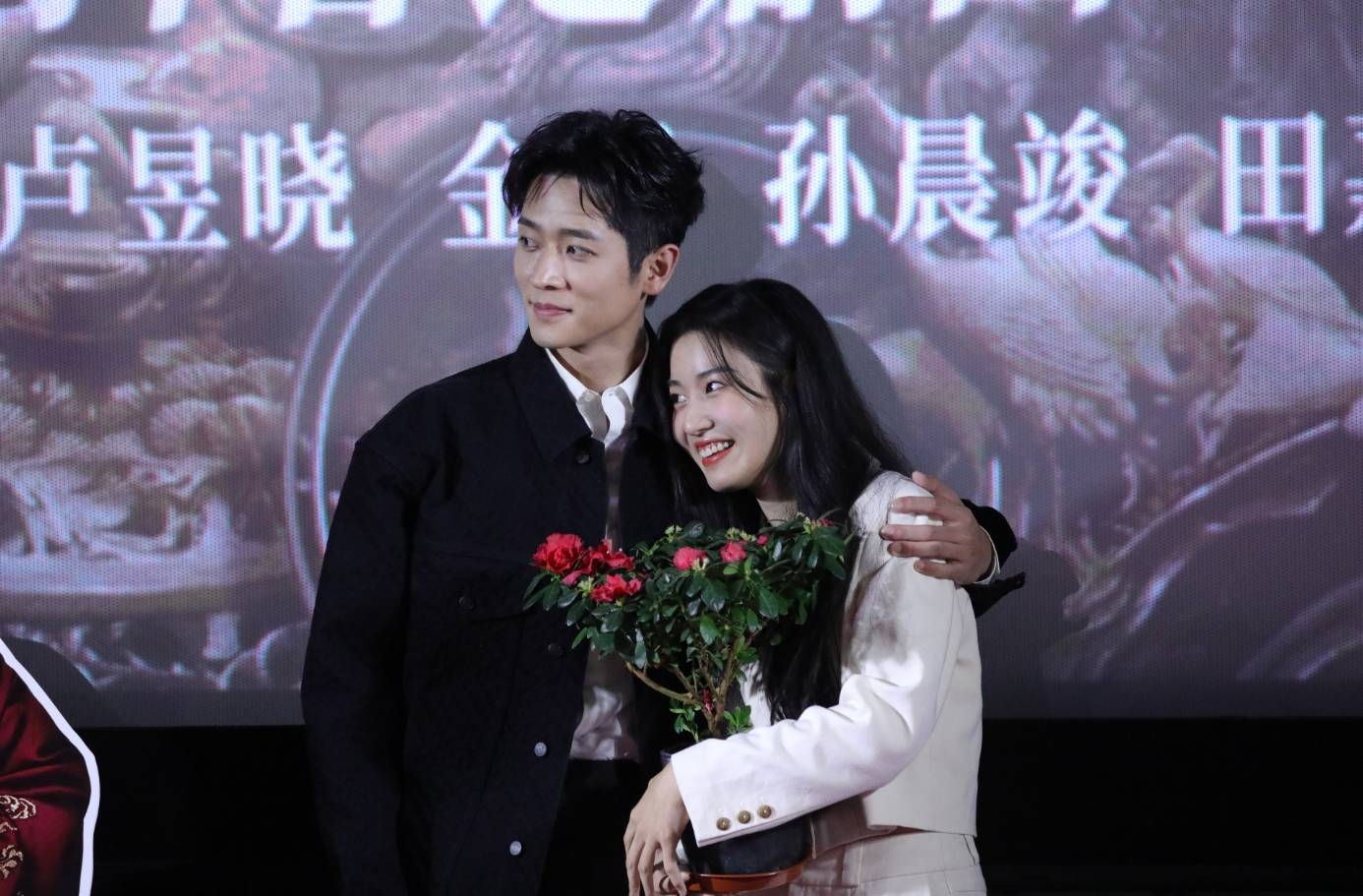 人气超高的“夜色尚浅”同样现场发糖,丞磊卢昱晓不仅甜蜜搂肩合照,还现场重新演绎了大结局。丞磊即兴改词“回角宫,再好好泡个澡,以后好好在角宫呆着”,引得现场一片尖叫,圆了广大剧迷的梦。