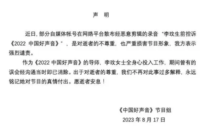 李玟录音流出并发酵后,好声音官微第一时间站出来发声,称这段录音是经过后期剪辑的,原录音表达的不是这个意思!
