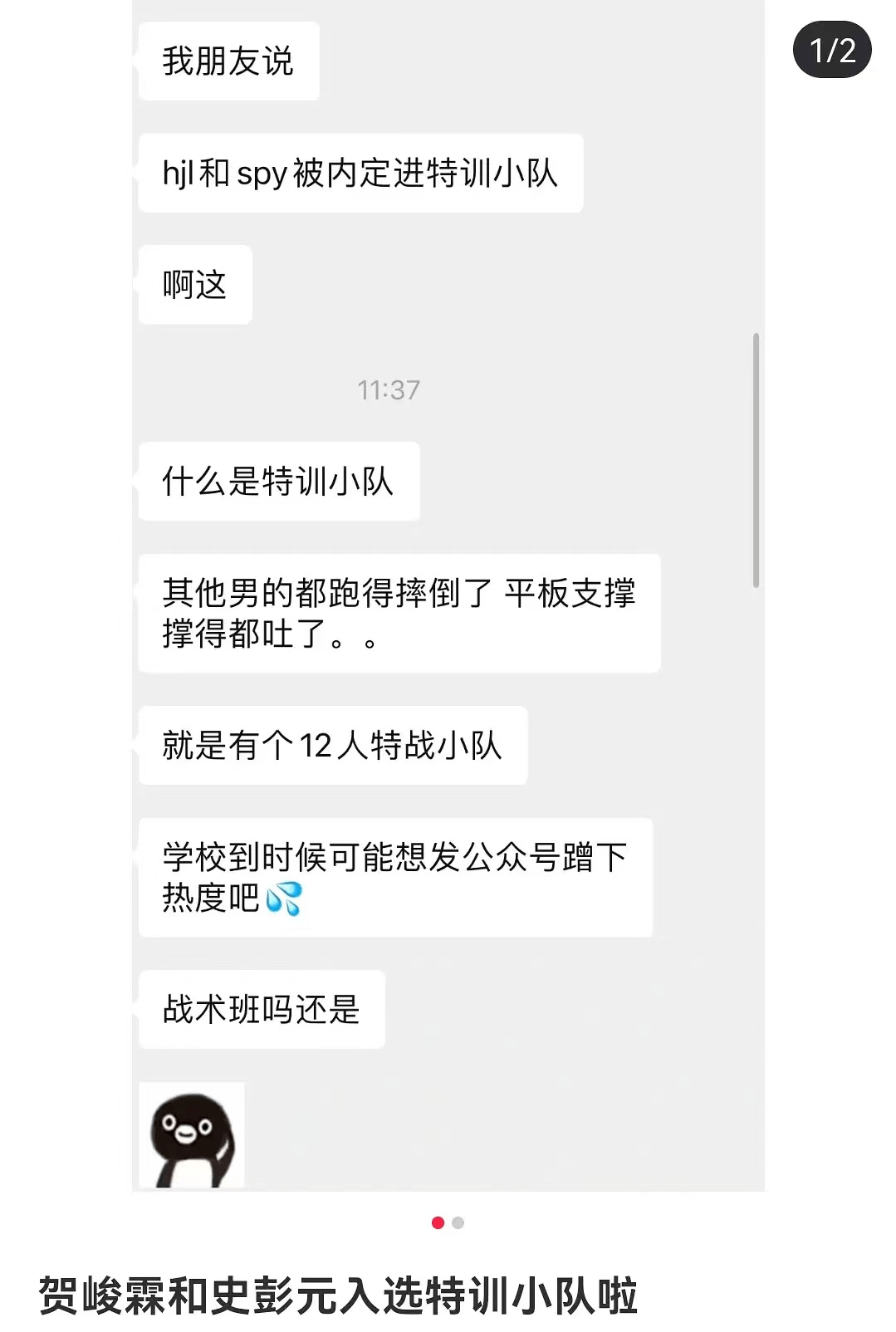 爆出的资料是一段微信对话,暗指贺峻霖没有经过跑步、平板支撑等一系列的入队选拔赛,而直接进入了特训小队。