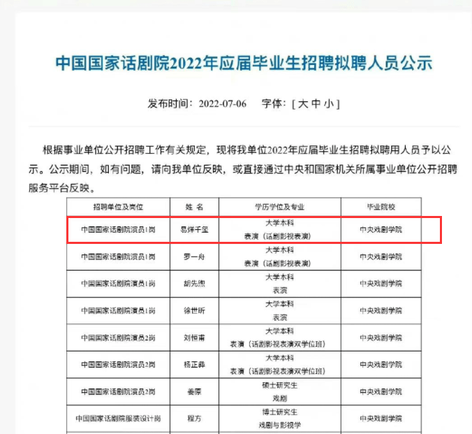 2022年,中国国家话剧院公示的拟聘应届毕业生名单中,排在第一位的就是易烊千玺。