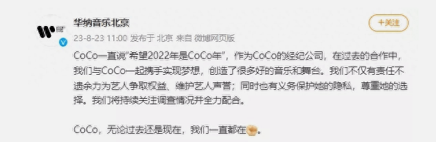 2023年8月23日,也就是李玟录音流出后不久,华纳音乐北京官微发声,称要不遗余力为艺人争取权益,维护艺人声誉,同时保护她的隐私,尊重她的选择,会持续关注好声音调查进程!