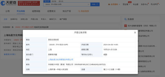 近日,天眼查App显示,中国好声音节目制作方上海灿星文化传媒股份有限公司新增一则开庭公告信息,被告为华纳唱片中国(香港)有限公司(WARNER MUSIC CHINA(HK)LIMITED),案由为其他合同纠纷,案件将于2024年4月9日在上海市第一中级人民法院开庭审理。目前,该案具体案由尚不清楚。