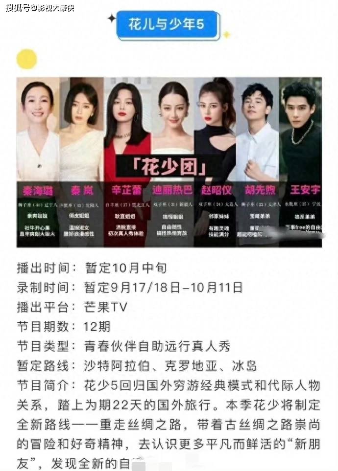 近日,《花儿与少年》终于要在它的第10个年头,迎来第5季节目。看到这个消息,真的要说一声节目不容易。这一季的成员包括大姐秦海璐、二姐秦岚、三姐辛芷蕾、四姐迪丽热巴、五妹赵昭仪,以及在前几季中留下深刻印象的大哥王安宇和小弟胡先煦。22天的奇妙之旅正式拉开帷幕,让我们一起出发,探索国外的精彩旅行!