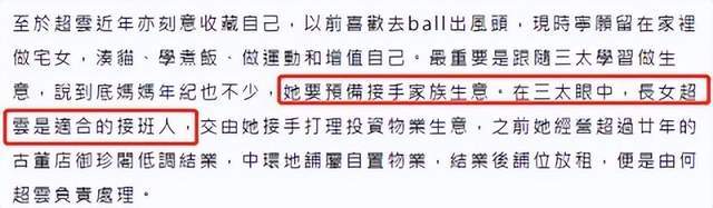 三太太陈婉珍只有何猷启一个儿子,但相比于因为家庭关系频频引发热议的儿子,她自认女儿何超云才是最适合的接班人人选,甚至早早的就将家族生意交给女儿打理。