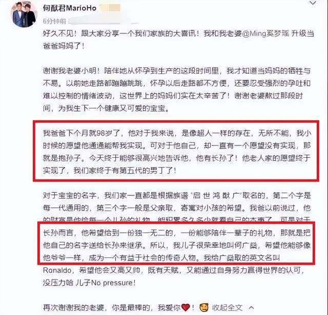 儿子出生当天,何猷君更是在社交平台上发长文感叹父亲终于实现了心愿,有了“长孙”。