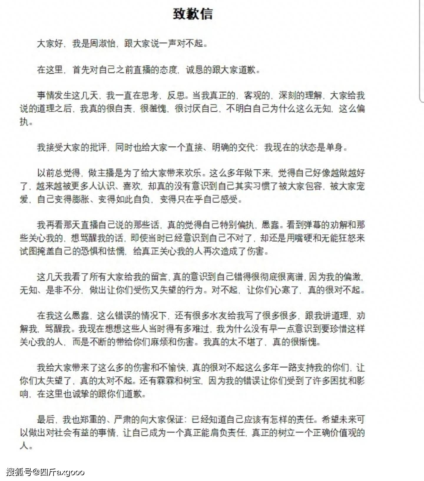 除了这份道歉视频,周淑怡还专门把视频文字整理成了一份道歉信,发布在个人账号上,面子和里子都做足了功夫,显得很有诚意。