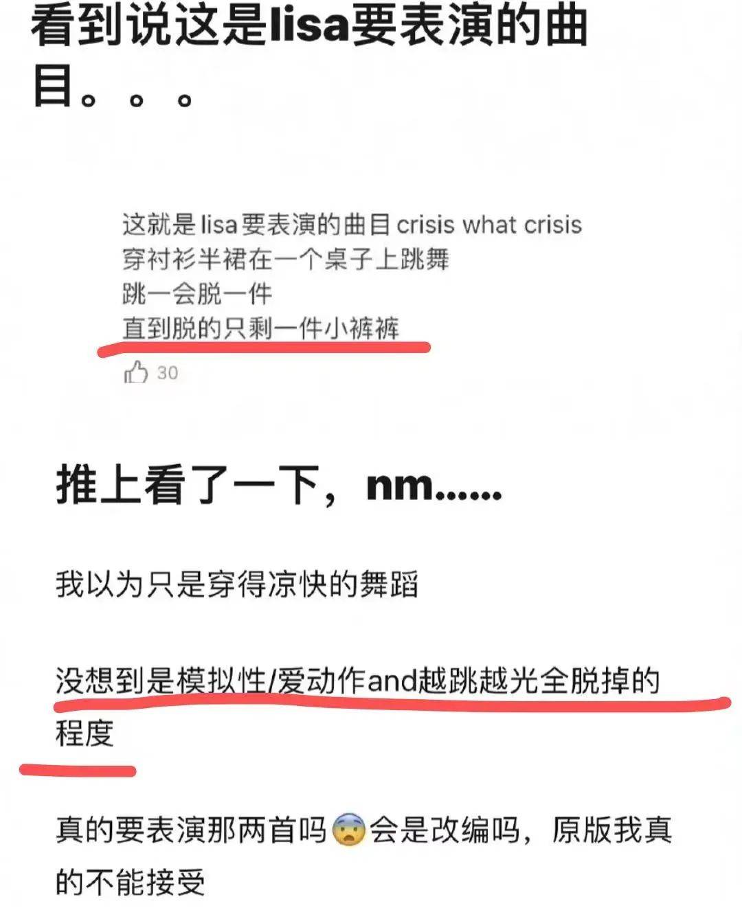 而且更要命的是,Lisa在疯马秀上的表演曲目被曝,其中之一是“香槟杯”《Crisis What Crisis》,这是一首经典曲目,舞者在台上边唱边脱衣,直到基本露出三点,最后跳进酒杯热舞。