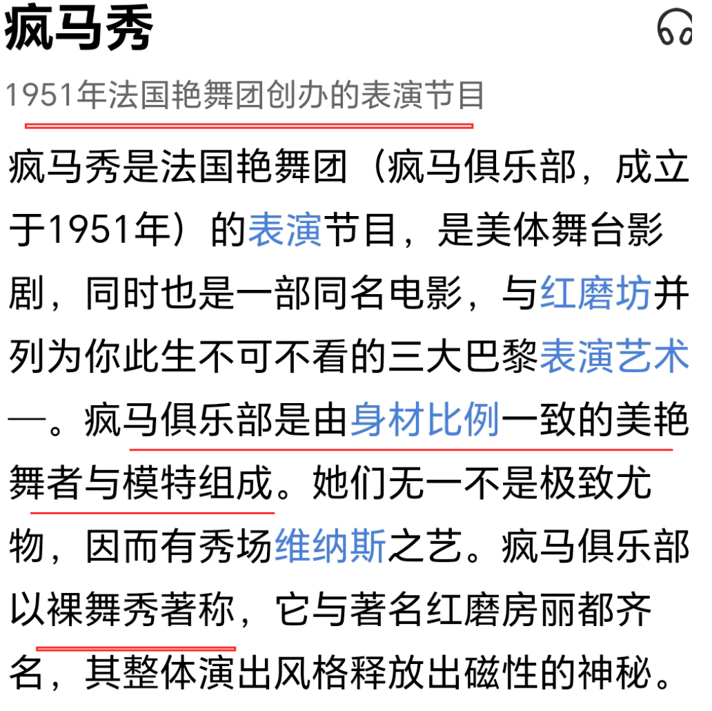 它成立于1951年,是法国夜总会艳舞团的表演节目,专供有钱人消遣,