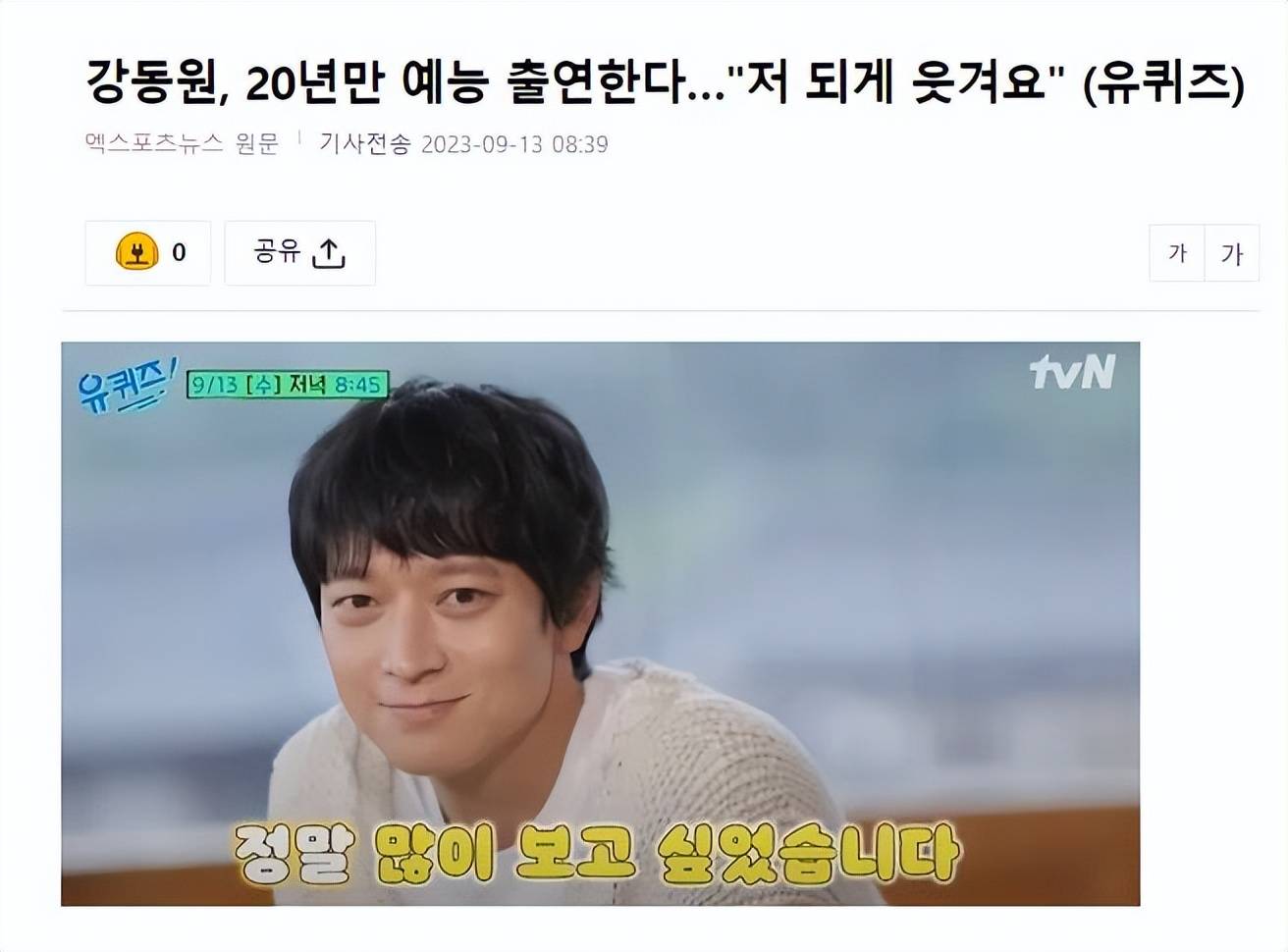 13日,有韩国媒体报道,演员姜栋元将出演今日播出的综艺节目 《You Quiz》与刘在石会面,姜栋元时隔 20年来首次出演综艺节目《You Quiz》,展现了自己的娱乐实力。