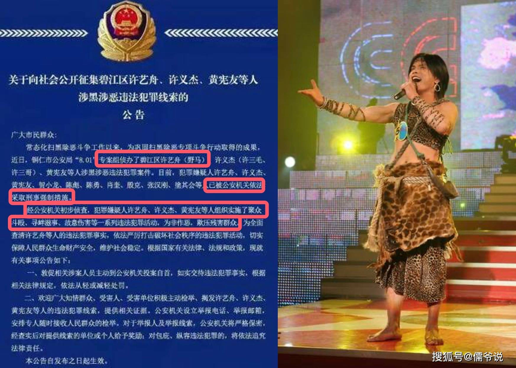 近日,又有一位选秀明星因为自己的所作所为而塌房了,而且他塌房塌得很彻底,直接被蓝底白字通报,并被警方依法采取刑事强制措施。他就是网红歌手“野马”许艺舟,因为表演时,常常打扮得像个野人,穿着兽皮草裙,所以给自己取了艺名叫做“野马”。