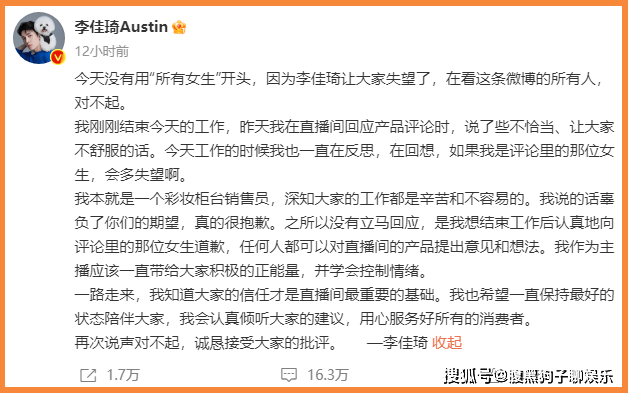待到11日凌晨,李佳琦的道歉姗姗来迟。