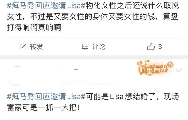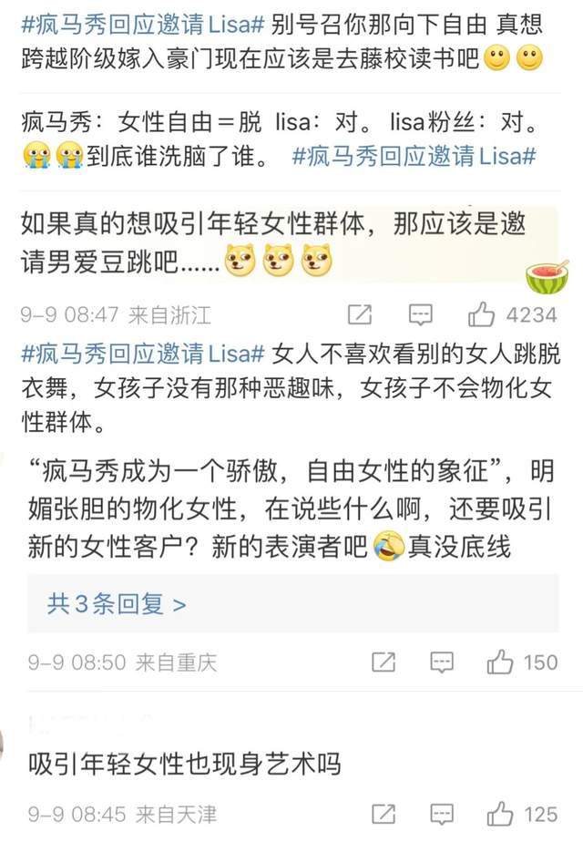 看过疯马秀的这番言论之后,网友们直呼太离谱,在线开始吐槽。多数人质疑疯马秀所谓的“吸引年轻女性”,莫非是在误导女生们投身“艺术”,加入疯马秀的演出队伍?还有网友耿直发言,认为疯马秀的“女性自由”一说,完全就是借口,实质就是在物化女性,让女性沦为媚男的工具人。更有网友调侃Lisa想嫁豪门的心太过迫切,估计借助疯马秀的演出可以实现心愿了吧。