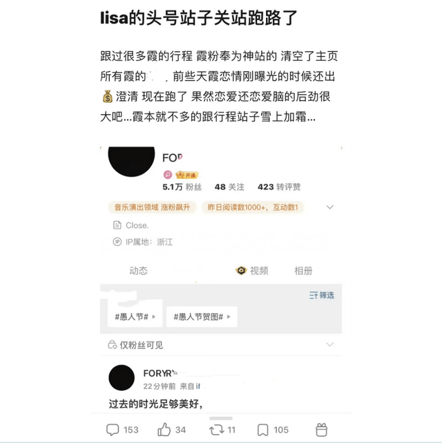 相比网友的质疑声,粉丝们怎么看呢?Lisa的一位陈年站姐已经封号脱粉,这位站姐发文表示:过去的时光足够美好。一句告别宣言尽显无尽伤感。据悉,这位站姐是Lisa中国粉丝群中的神级人物,经常跟拍Lisa的各种活动。之前站姐曾为Lisa出钱澄清恋情绯闻,如今已清空所有与Lisa有关的内容,还把头像换成黑色。网友认为这位站姐一跑,Lisa在中国的粉丝就更是艰难了。