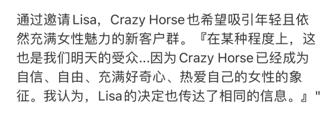 对此,疯马秀回应称,这个品牌已经成为女性自信自由自爱的象征。而且,Lisa加盟演出也能吸引到其他年轻女性更多关注疯马秀。主办方认为这正好是一举两得,Lisa可以尽情展现她的自信自爱,主办方也能借着Lisa增加关注。