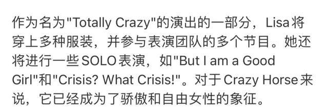 同时举办方还公布了演出的曲目和具体安排,比如Lisa会作为"Crazy Girl"完成5场演出,其中还提到Lisa将在演出中穿上多套服装。按照疯马秀的表演传统,所谓的服装应该不是一般的打歌服,或是大牌礼服,而是类似舞娘蒂塔·万提斯的演出造型。正是因此,众多粉丝才感到很难接受。