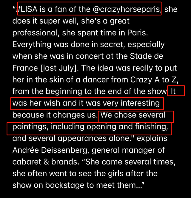 对于Lisa参加疯马秀的舆论热议,主办方很快发文回应。在回应长文的一开头,疯马秀直言Lisa一直是疯马秀的粉丝,为了得到这次演出机会,Lisa不惜挤时间进行训练,还在巴黎住了一段时间。这一段话的言外之意很明显,不是疯马秀非要邀请她,而是她很钟情疯马秀,并且全程配合。