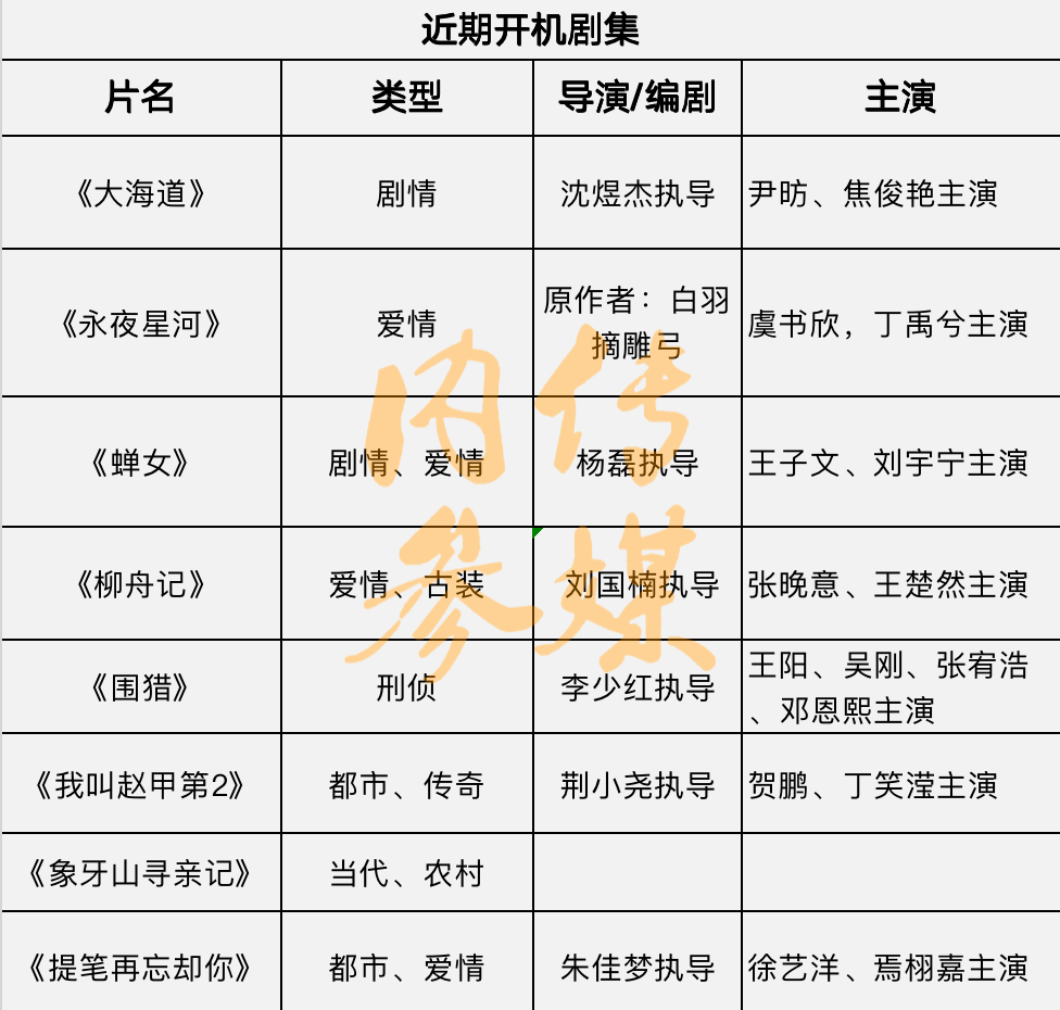 近期开机或预开机的新剧达8部以上,重点剧集包括《大海道》《永夜星河》《围猎》 等。