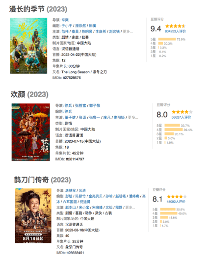 从口碑来看,《漫长的季节》获得豆瓣超83万人打分,并以9.4分的成绩成为近五年来豆瓣评分最高的国产剧集,《欢颜》《鹊刀门传奇》豆瓣评分也皆在8分以上。