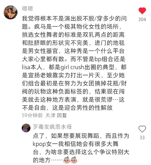 还有路人说,考虑到BLACKPINK不少粉丝都是未成年,Lisa如此“成年人”的演出,对粉丝来说是不是不太好。