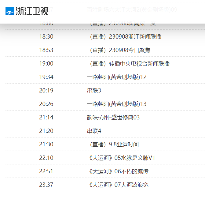 不过,查询浙江卫视的官网节目单,《中国好声音》并未在今晚(9月8日)的播出名单当中。这个《中国好声音》复播的节目单,只存在于电视猫等平台上。在浙江卫视自己的官网节目单当中,今晚会是《一路朝阳》的两集连播,电视剧播出完毕之后,则是《亚运时间》和《大运河》内容的播出。