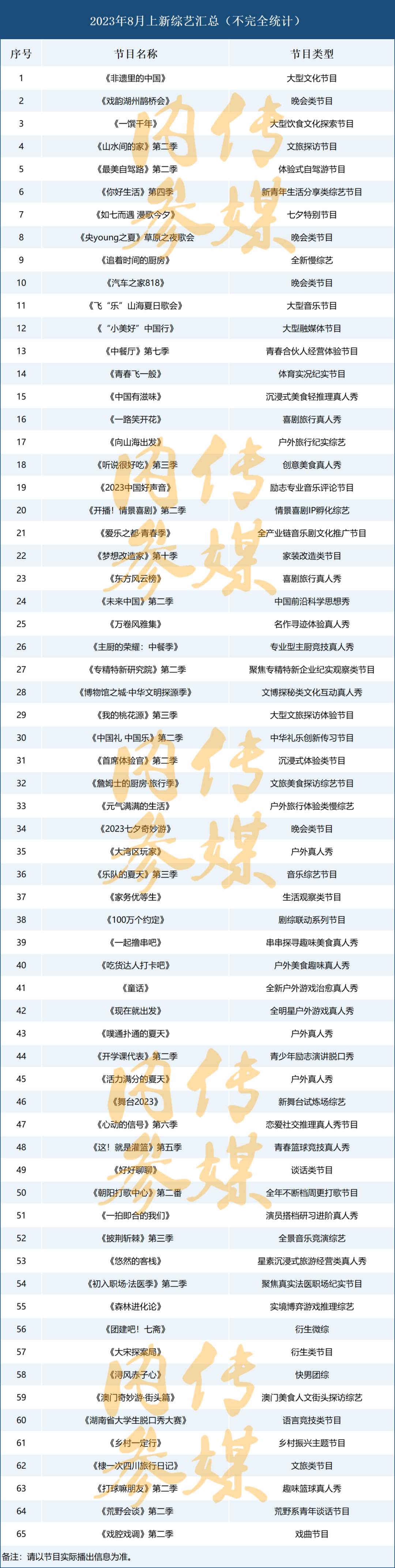 与此同时,传媒内参详细梳理了8月上新的65档节目,从中总结出重要的发展规律,主要概括为四大要点:第一,户外正青春和剧综新联动,成暑期档节目创作新支点;第二,稳稳的综N代,在内容和商业上实现双丰收;第三,国民音综创新不断,大众美食常做常新;第四,文旅题材与人文底蕴,成主流节目创作“双子星”。