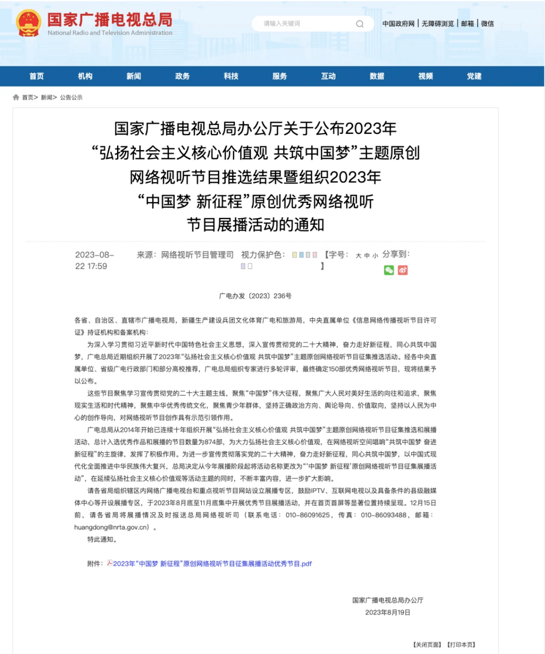 8月22日,国家广播电视总局公布2023年“中国梦 新征程”原创网络视听节目征集展播活动优秀节目名单,19档综艺入选。与此同时,释放出当下节目创新的信号:其一,现实主义题材正成为当下创新创优的主流节目品类;其二,人文类主题依旧是入选当下优秀精品节目创作的重要主力军。