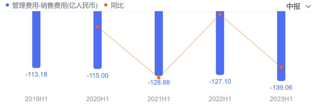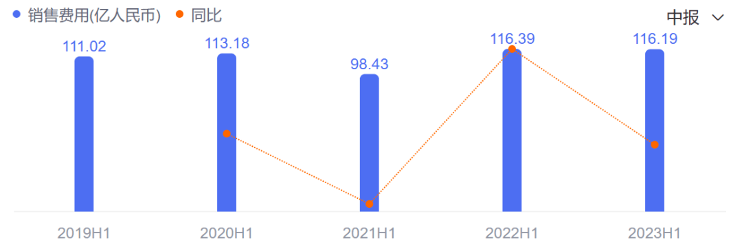 然而,在2023年上半年,这一趋势开始回升,蒙牛的销售费用达到139.06亿元,拉出近五年的新峰值,同比增长9.4%。且据公司方面表示,其中用于产品和品牌宣传的费用增加至约51.2亿元,几乎与2022年全年持平。