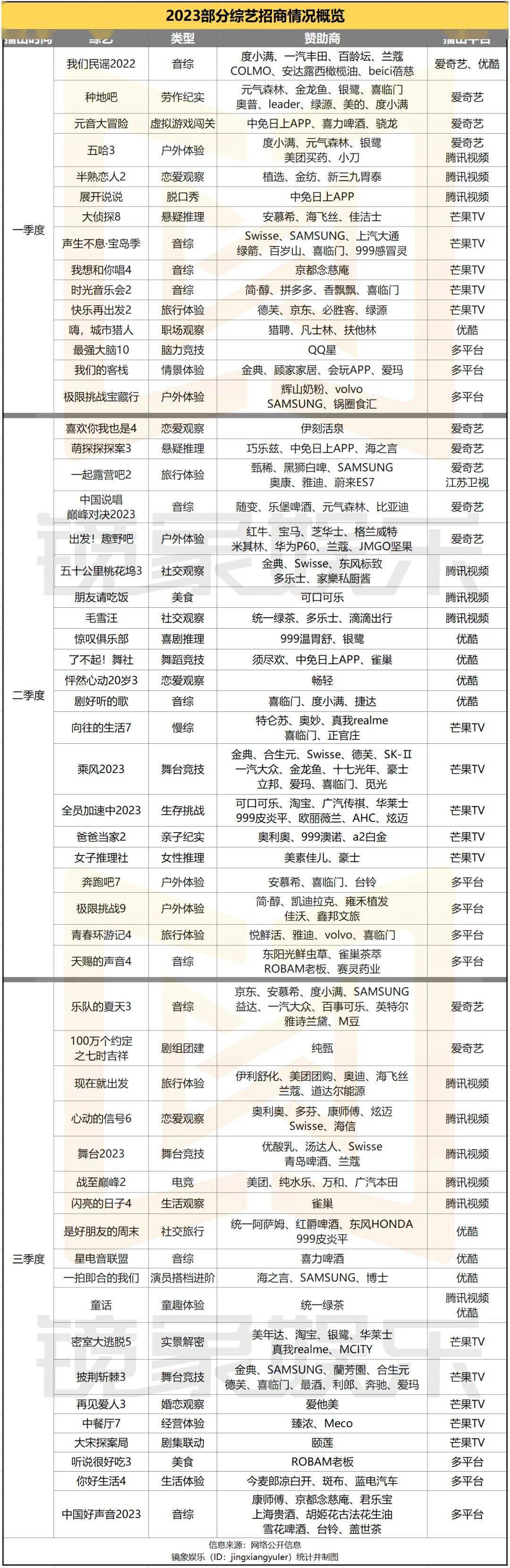 此外,高产的音乐赛道对品牌方也有着持续的吸引力。综N代方面,《中国好声音2023》《乐队的夏天3》的招商列表中,分别站着8家、10家赞助商。新综艺方面,年初热播的《我们民谣2022》也拿到度小满、一汽丰田、兰蔻等8家品牌合作;迎来第二季的《声生不息·宝岛季》也有7家赞助商。