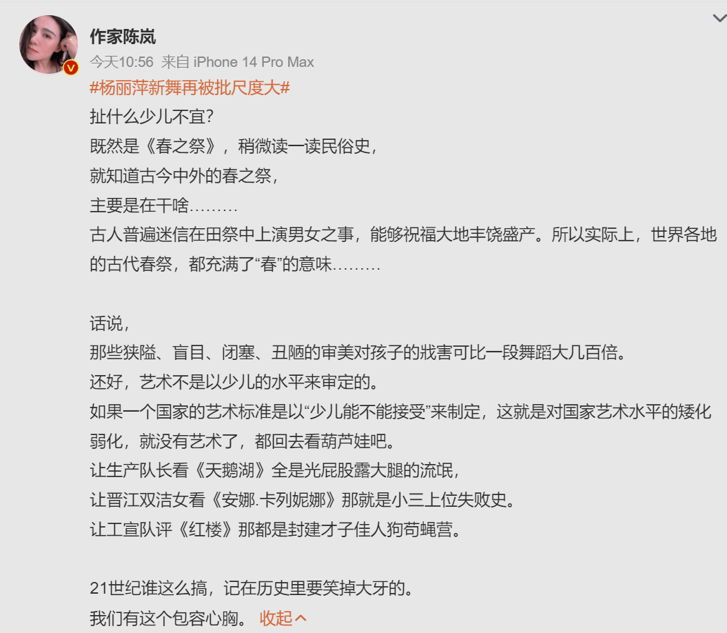 有大V也表示,不要扯什么少儿不宜?更是指出,那些狭隘、盲目、闭塞、丑陋的审美对孩子的戕害可比一段舞蹈大几百倍。