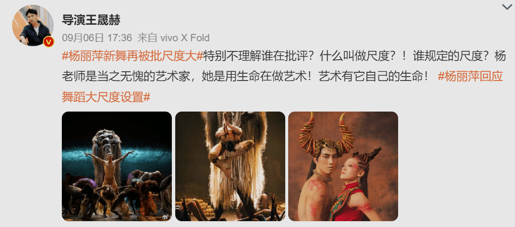 也有导演说道:“特别不理解谁在批评?什么叫做尺度?!谁规定的尺度?杨老师是当之无愧的艺术家,她是用生命在做艺术!艺术有它自己的生命!”