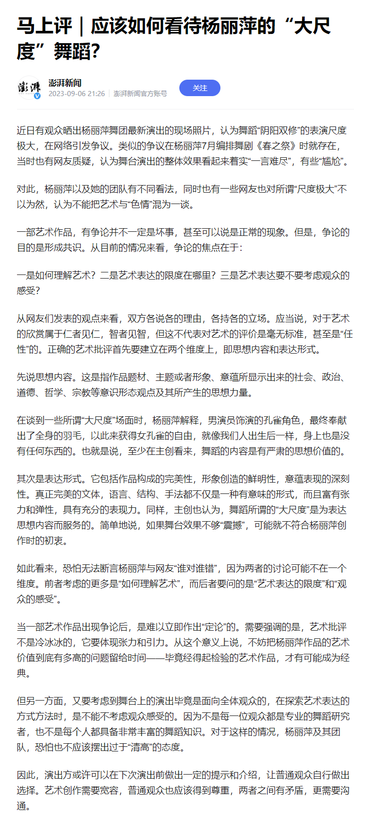 如此看来,恐怕无法断言杨丽萍与网友“谁对谁错”,因为两者的讨论可能不在一个维度。前者考虑的更多是“如何理解艺术”,而后者要问的是“艺术表达的限度”和“观众的感受”。