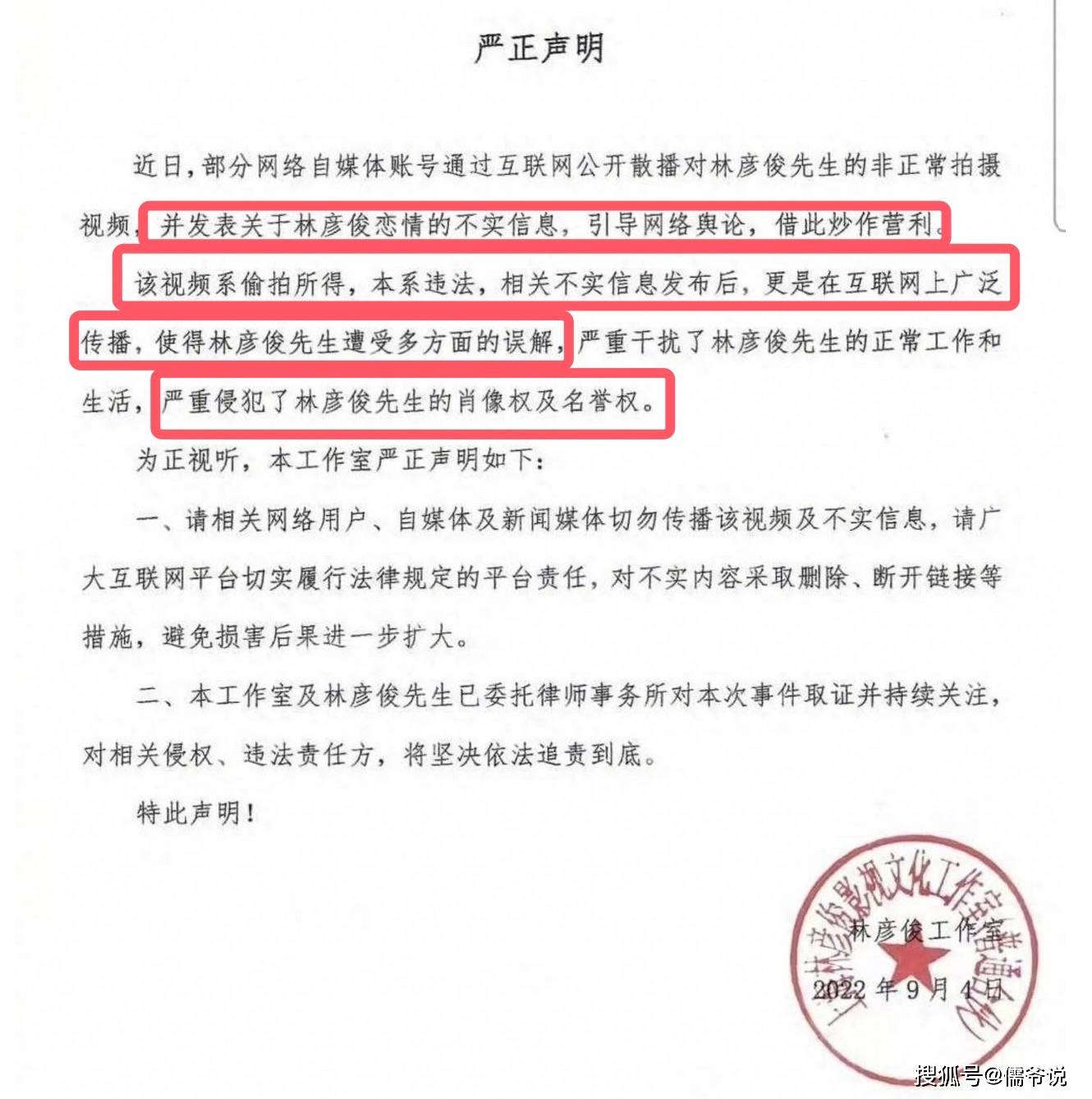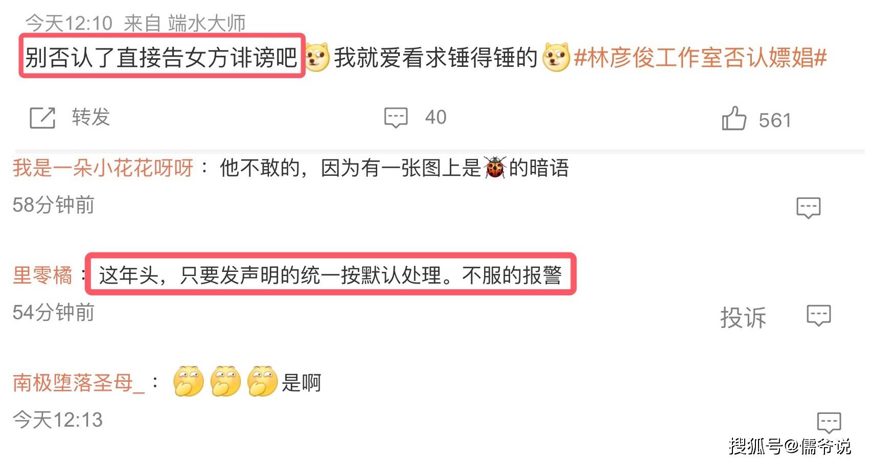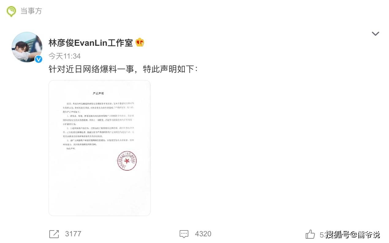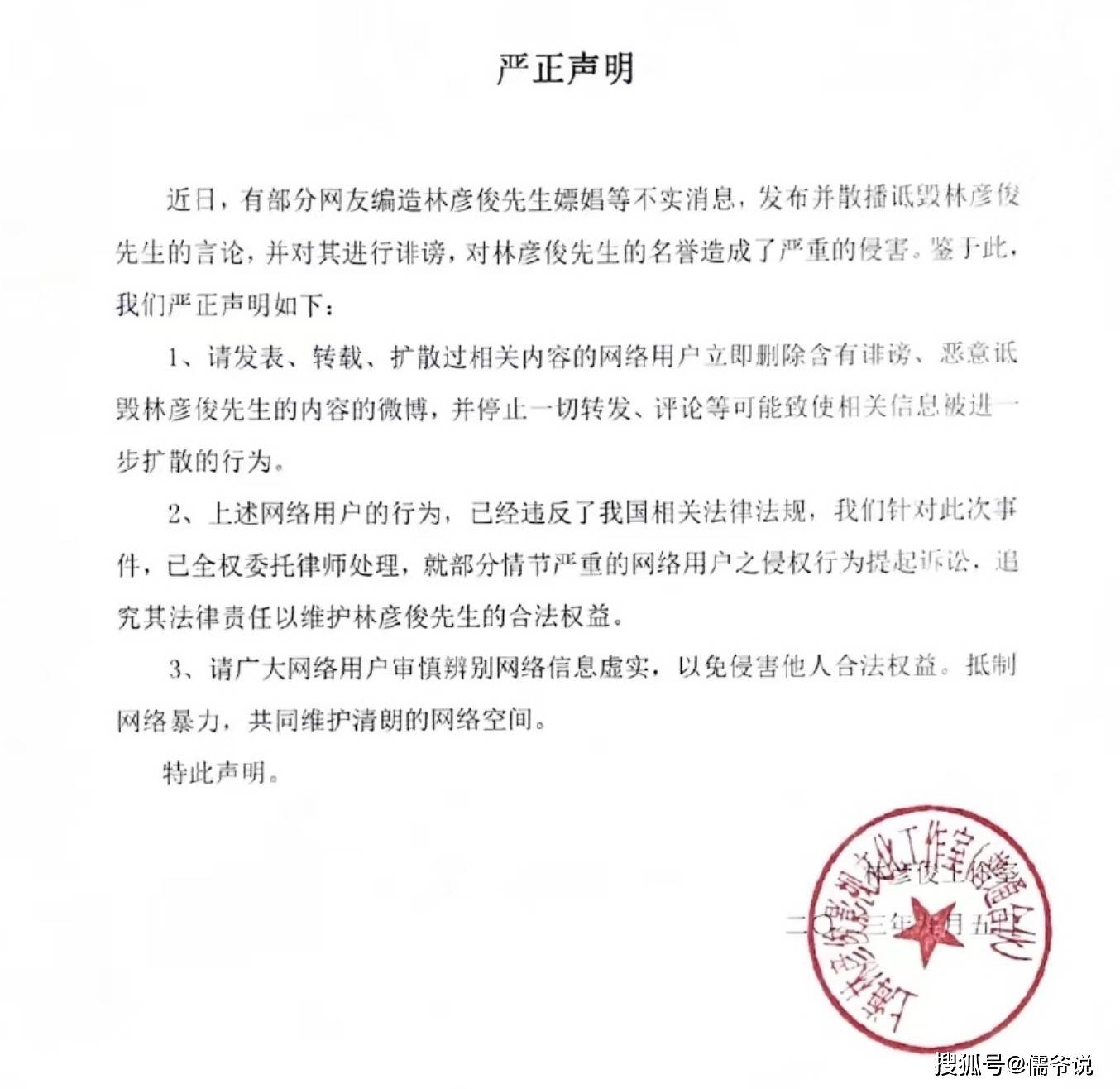 不过,针对千不二子的爆料,林彦俊方也是站出来发声回应了。林彦俊工作室发声回应,表示网传的嫖娼等消息,全都是网友的恶意诋毁,全是不实信息。现已经委托律师处理了。