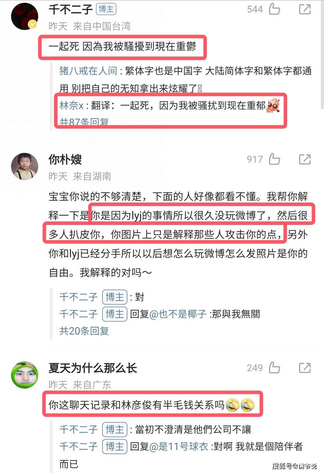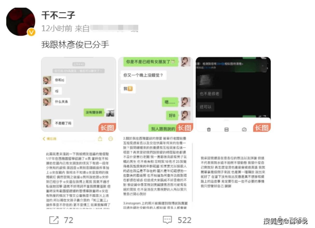 不过,因为千不二子晒出的聊天记录,里面的姓名全都使用了缩写,并且提到的内容也都比较陌生,导致许多人没有看懂。更有网友表示疑惑,你晒出的聊天记录和林彦俊有半毛钱关系吗?不过千不二子表示当初没有承认这段恋情,是因为男方的经纪公司不允许她公开承认恋情,认为这有让男方塌房。如今分开了,见到自己这么伤,因此想将对方拉下水。